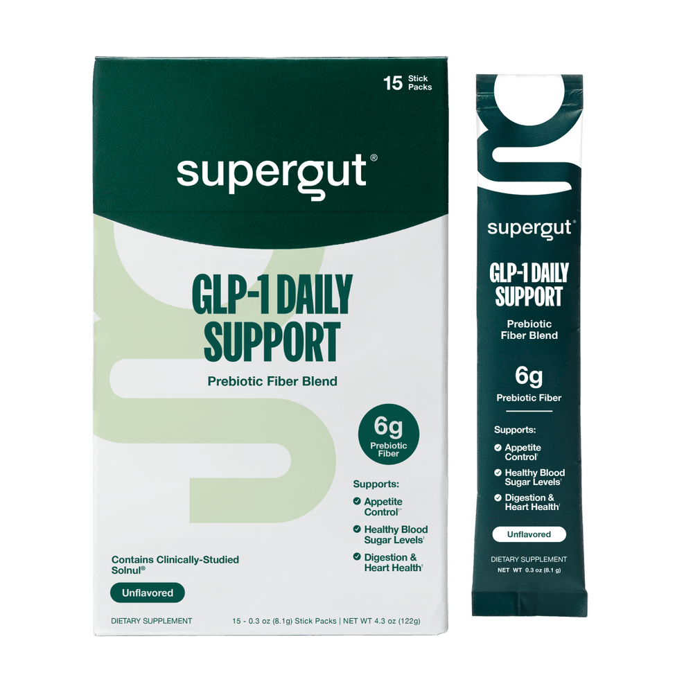 Yes! GLP-1 Daily Support is an ideal complement to other Supergut products, and are perfect for curbing cravings and getting your always-important daily fiber in your favorite foods and drinks. With 6g of prebiotic fiber featuring resistant starch in convenient single-serving stick packs, you can integrate our GLP-1 Daily Support right into your daily lifestyle without missing a beat.